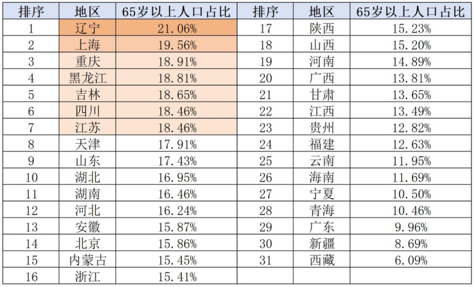 与之对比,广东60岁以上人口占比仅为14%,65岁以上人口仅为10%,在全国倒数。