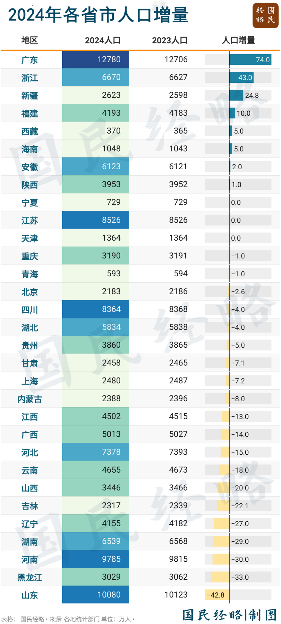 根据《20多个省,人口负增长》一文,2024年内地31个省份中,只有8省人口正增长、3省零增长,近2/3省份都是负增长。