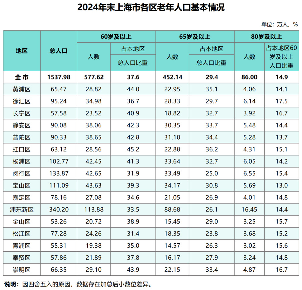 截至2024年末,上海户籍人口1538万人,其中60岁及以上人口577.6万人,占比37.6%;65岁以上452万人,占比29.4%。在各大城区中,虹口区、黄浦区、崇明区占比分别为45.2%、44.0%和43.9%。