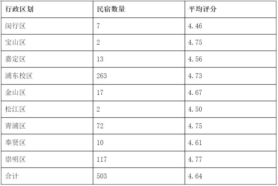 近年来,上海的乡村民宿得到迅速发展。以“民宿”为关键词,我们从携程网上爬取了位于上海的1858家民宿数据,手工整理,剔除非乡村民宿数据后,剩余503家乡村民宿。这些民宿分布在上海的9个区。其中,乡村民宿最多的是浦东新区,有263家;其次是崇明区,有117家;最少的是宝山区和松江区,分别为2家。从携程住客的评分情况来看,平均得分为4.64分,崇明区得分最高,为4.77分;其次是宝山区4.75分;得分最低的是闵行区,为4.46分(表2)。