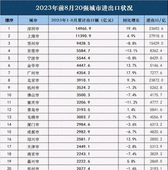 2023年1-8月苏州市外贸实现进出口15429.54亿元,下降11.3%,其中出口9428.47亿元,下降8.8%,进口6001.07亿元,下降14.9%,苏州外贸全国第3,从年初开始就一直是下跌状态,到前8月出口跌幅还高达8.8%,很是不理想。其中苏州市因此前8月的出口值掉出了万亿,比第2的上海已低近2千亿;