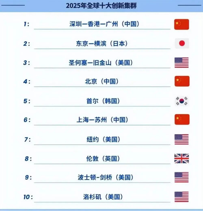 然而,全球第六位的“上海—苏州”集群,看似光鲜,实则处于全球科创竞争的“风暴中心”。2025年WIPO《全球创新指数》报告揭示的格局,足以说明这场竞争的激烈程度——创新集群的比拼已从“单点突破”升级为“生态对决”,成为各国争夺全球价值链顶端的关键战场。