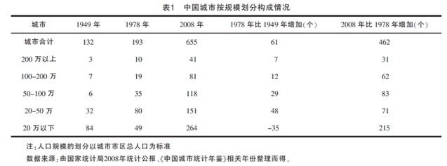 建国初期,大城市寥寥无几,1949年在132个城市中100万人口以上城市仅有10个,占7.6%。在1949-1978年的城市发展过程中,一方面原有的城市规模在不断扩大,大中城市的数量不断增多;另一方面在大中城市发展的同时,由于城乡的分隔,商品经济的萎缩,劳动密集的小型工业发展不足,新形成的小城市的数量却不多。形成了城市结构头重脚轻的格局。小城市和小城镇的发展不足,成为城市化进程的严重障碍。