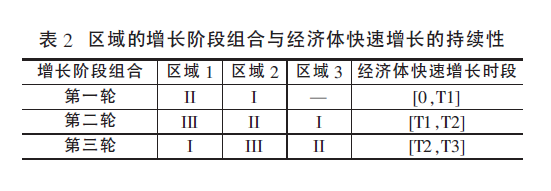 我国是一个大国,由于发展条件和机遇等方面的不同,各区域之间存在着明显的经济增长阶段的异质性。当长三角、珠三角和京津冀等区域处于快速增长阶段(Ⅱ)时,其他区域还处在缓慢增长阶段(Ⅰ);当长三角、珠三角和京津冀等由第一代空间进入第三阶段(Ⅲ)时,另外一些区域即区域发展新空间刚好处在第二个阶段(Ⅱ),接替第一代空间发挥着对全国经济增长的支撑作用,于是就形成了一个区域接力增长的持续态势(见表2)。如果能够合理组织不同类型区域的快速增长阶段,就能实现比单类区域更长时间的持续快速增长。