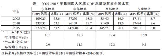 “十一五”以来,东部地区受国际金融危机的影响比较严重,经济增长的速度开始慢于国内其他地区,在全国的地位有所下降,产业向中西部地区转移的趋势开始加速。2008年以来中部和西部地区经济增速不断加快,经济总量占全国比重开始上升(见表1)。2010~2015年,东部与西部地区人均GDP比值由2.06︰1下降到1.81︰1。