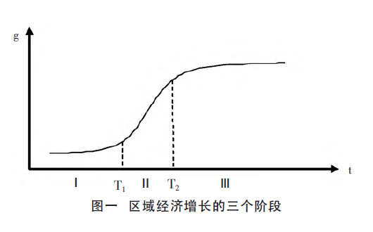 对一个区域而言,经济增长分为缓慢增长阶段(Ⅰ)、快速增长阶段(Ⅱ)、增速减缓或者结构调整阶段(Ⅲ)(见图一)。世界发达国家和新兴工业化国家的经济发展历史表明,在一定时期内一个国家的经济发展主要是由部分处于快速发展阶段的区域带动和支撑的。如果一个区域处于第二个阶段,就有可能成为全国的发展空间。改革开放以来,我国经济持续快速增长是与多元化的区域经济紧密相关的。我国如能有效利用区域之间发展阶段的差异,形成区域接力发展、梯次推进态势,有序传递支撑全国经济发展的接力棒,就有可能实现经济更长时间的持续健康发展。[12]