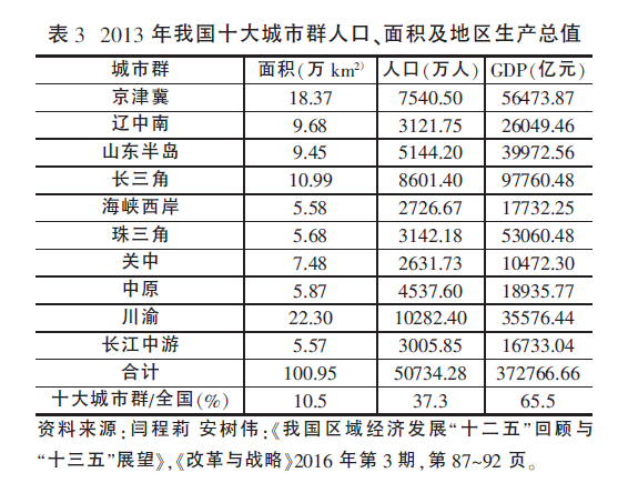 城市群已成为支撑世界各主要经济体发展的核心区,国家间的竞争正日益演化为主要城市群之间的综合实力比拼。[14]2013年,我国京津冀、长三角、珠三角等十大城市群土地面积仅占全国的10.5%,人口占全国的37.3%,GDP占全国的65.5%(见表3,下页),城市群已经成为带动我国经济中高速增长、促进区域协调发展、参与国际合作与竞争的主要平台。