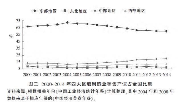 2000年以来我国制造业先向东部地区集中,2004年后由东部向中西部地区扩散(见图二),这也在一定程度上说明我国工业化和城镇化的空间载体正在向中西部地区拓展。