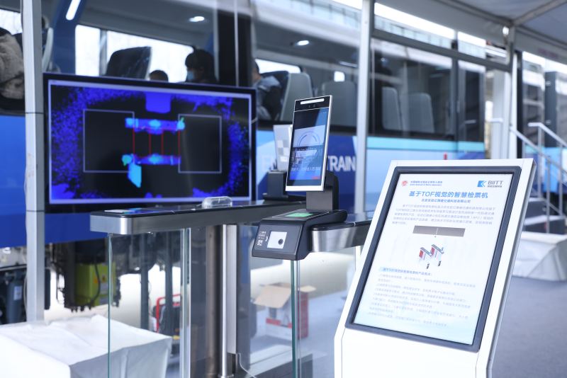 进入展区前,观众会先经过一组视觉智慧闸机,这是京投科技公司基于TOF相机三维立体成像技术打造的新一代轨道交通闸机产品,在传统人脸识别、二维码过闸基础上,该闸机打造通行区域内的智慧场景,能准确判断通过物体或行人的类别、外形、位置、通行速度等,精确识别过闸人员的行为模式,支持乘客无间隔通行,有效防止尾随、并行等闯闸行为。