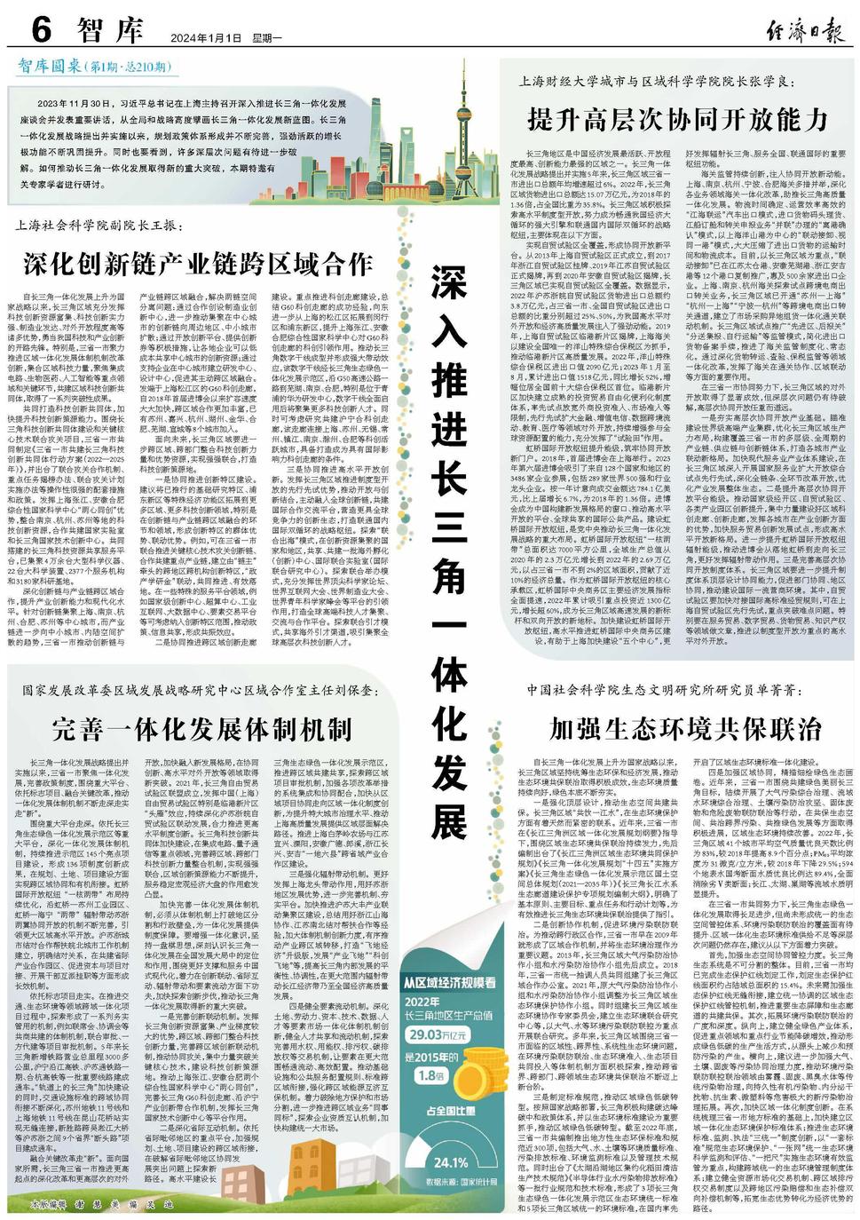 2023年11月30日,习近平总书记在上海主持召开深入推进长三角一体化发展座谈会并发表重要讲话,从全局和战略高度擘画长三角一体化发展新蓝图。长三角一体化发展战略提出并实施以来,规划政策体系形成并不断完善,强劲活跃的增长极功能不断巩固提升。同时也要看到,许多深层次问题有待进一步破解。如何推动长三角一体化发展取得新的重大突破,本期特邀有关专家学者进行研讨。