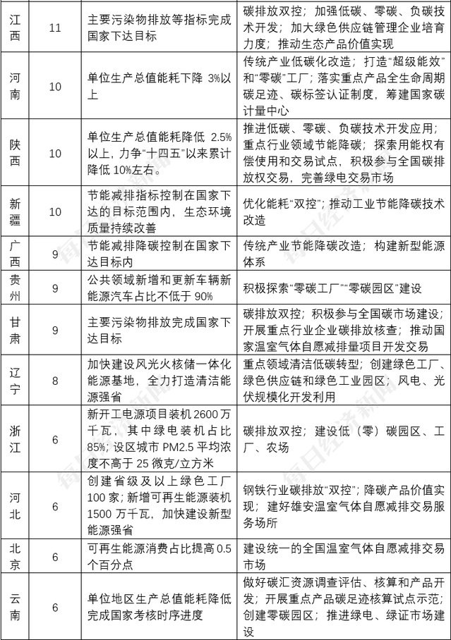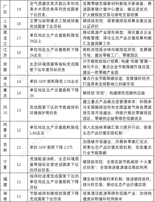 各地政府工作报告,都体现出对绿色低碳发展的重视。有的省份提出节能降碳要完成国家下达任务,有的提出了一些相关联的目标,但总体来看,没有提出明确的减碳目标。中央财经大学绿色金融国际研究院高级研究员严展表示,制定减碳目标,重要的是先摸清“碳家底”,再结合各地产业结构和能源结构的特点,有针对性采取减碳措施,合理制定不同阶段减碳目标。