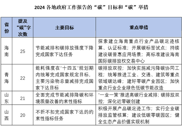 在具体举措上,各省份在2024政府工作报告中提出,主要从机制保障、市场建设、样本打造、技术创新及产业升级等方面来做好减碳工作。