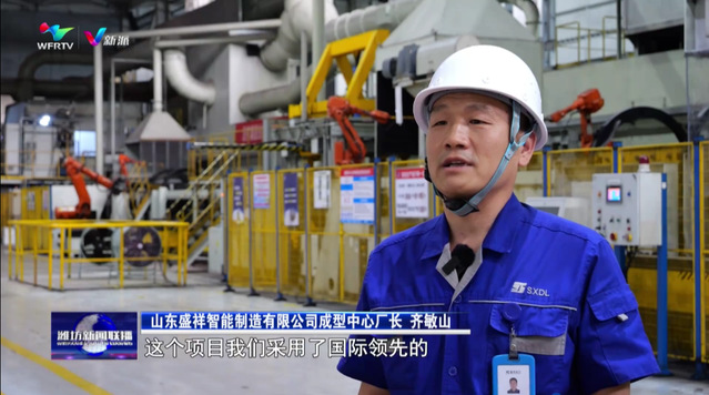 山东盛祥智能制造有限公司成型中心厂长齐敏山:“这个项目我们采用了国际领先的绿色熔炼、定量浇注等工艺,可以达到“无烟、无尘、无异味、低噪音”的标准。传统铸造产业大多伴随着高耗能、高污染,通过智能化转型,目前企业污染物排放量已经能控制在每平方米5mg以内。”