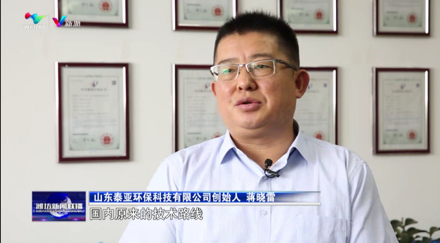 山东泰亚环保科技有限公司创始人蒋晓雷:“工业污水的深度处理,国内原来的技术路线,一个是复杂的工业污水不能稳定的达标排放,第二是运营成本过高,针对这个情况,我们研究了靶向吸附工艺,而且这些吸附材料都可以再生、循环使用,我们的运营成本是传统的1/5到1/6。”