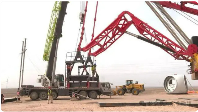 在酒泉锐鸿饮马峡D区 20 万千瓦风电场项目建设现场,机器轰鸣,施工正酣,工人们正在紧张有序吊装机组设备。