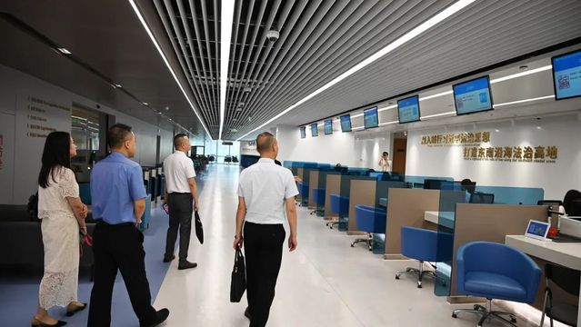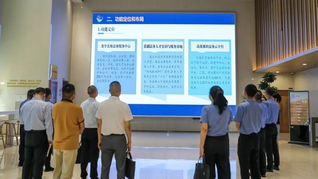 与会人员参观了海丝中央法务区福州片区服务中心,现场感受法务区为企业和群众提供的全流程、一站式的各类法务、泛法务服务,沉浸式体验自助阅卷机等一系列便民举措,深入了解法务区在发展现代化法律服务等方面取得的成效。