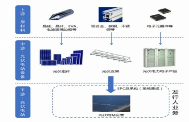 光伏发电行业的产业链可以划分为三个核心环节:产业链的上游主要涉及晶体硅、钢材等原材料的生产;中游包括逆变器、光伏组件和支架等设备的制造;下游领域主要为光伏电站的EPC(工程、采购、建设)承包和电站的运营与管理。