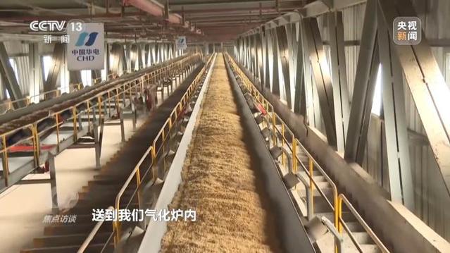 湖北华电襄阳发电有限公司生物质运维部副主任 杨涛:生物质燃料通过皮带进料口送到气化炉内,产生一氧化碳、氢气、甲烷等可燃气体,然后通过管道将可燃气体送到燃煤锅炉内与燃煤混合燃烧,实现了生物质与燃煤机组的耦合发电。