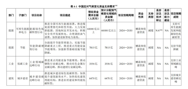 界面新闻注意到,在披露的中国应对气候变化资金需求支持方面,能源预估资金需求总额最高,达6万亿元以上。