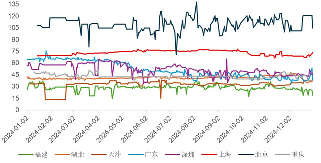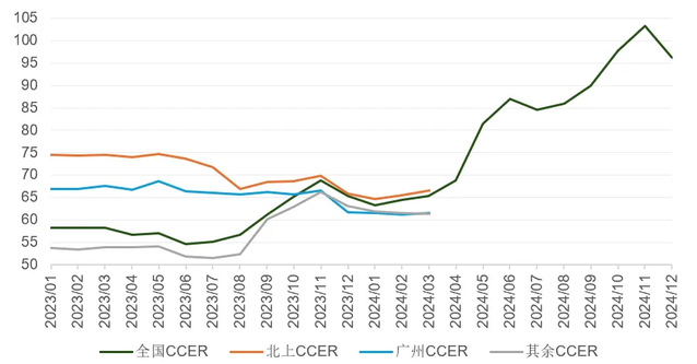 如下图所示,2024年的预期CCER价格呈现两个主要趋势:一是用于全国碳市场履约的CCER价格预期在2024年呈现出持续的大幅上升趋势,除价格走势的整体形态与全国碳市场碳价趋于一致外,进入四季度后其价格预期基本与全国碳市场碳价持平,显示出履约清缴抵消需求与存量CCER供应持续缩减对CCER价格的显著支撑作用。二是进入2024年后用于全国和不同地方碳市场履约使用的CCER价格预期差较2023年大幅缩小,维持在5元/吨以内,这再次显示出随着存量CCER供应逐渐缩小,不同类型市场参与主体履约清缴抵消所需的CCER额度也越来越紧张,推动跨市场间CCER价格趋于一致。