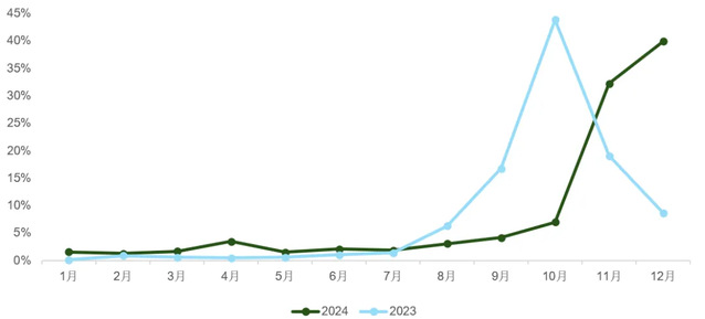 图2:2023 – 2024全国碳市场各月成交量占总成交量的比例