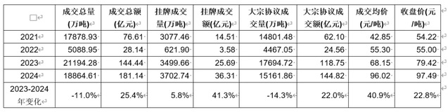 具体来看,2024年全国碳排放权市场的交易中,挂牌协议成交量为3702.7万吨、成交额为36.31亿元,分别占CEA年成交总量与总额的19.6%和20%,占比较2023年的16.5%与17.8%均有显著上升。其中,年内挂牌协议成交均价为98.06元/吨,较2023年的73.42元/吨大幅上涨33.6%;此类型交易年终收盘价为97.49元/吨,较上年度最后一交易日收盘价上涨22.75%。