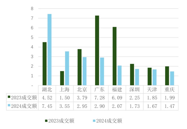 从成交额的年度对比来看,地方试点碳市场2024年的总成交额达23.79亿元,较2023年同比下跌约18.7%,下跌幅度大于总成交量跌幅。与成交量类似,各试点碳市场的成交额也呈现明显分化走势:湖北与上海碳市场的成交额同比分别上涨2.93亿元和2.05亿元,涨幅达64.9%和136.4%,其他试点碳市场的成交额则出现不同程度下跌。
