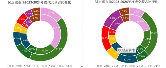 图10:2023 – 2024各试点碳市场成交量及成交额占比变化(内圈为2023年数据,外圈为2024年数据)