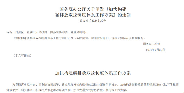 2024年8月,国务院办公厅出台的《加快构建碳排放双控制度体系工作方案》,针对区域提出“推动省市两级建立碳排放预算管理制度”,针对行业提出“建立行业领域碳排放监测预警机制”。
