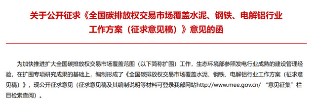2024年9月,生态环境部发布《全国碳排放权交易市场覆盖水泥、钢铁、电解铝行业工作方案(征求意见稿)》,提出“2024 年作为水泥、钢铁、电解铝行业首个管控年度,2025年底前完成首次履约工作”,这是全国碳市场建立以来的首次扩容。