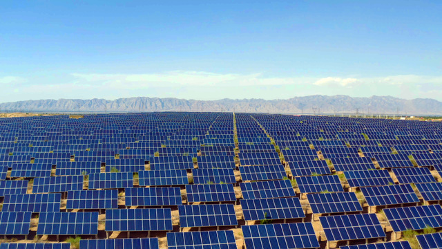 内蒙古防沙治沙和风电光伏一体化工程——库布其沙漠“光伏长城”。图片由被访单位提供
