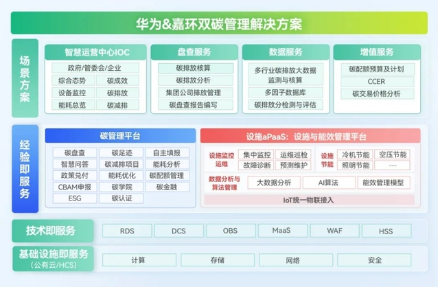 此次合作聚焦双碳场景,基于华为云设施aPaaS平台与嘉环科技双碳应用底座,联合构建“双碳管理联合解决方案”,打造覆盖"政府-园区-企业"的能碳智慧中枢。