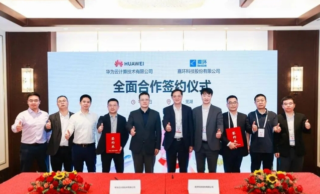大会期间,嘉环科技与华为云正式签署全面合作协议,宣布深化双碳领域协同创新。双方将整合商机共享、联合营销等资源禀赋,聚焦绿色低碳解决方案开发与优质市场拓展,加速产业绿色智造升级。嘉环科技双碳军团军团长柏小东、华为云江苏生态发展与运营部部长分别代表双方完成签约,嘉环科技董事长宗琰、嘉环科技董事兼CMO韩保华,华为云全球生态部总裁康宁、华为云IOT设施aPaaS总经理共同见证,标志着双方从业务协同迈向生态共建新阶段。