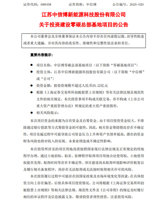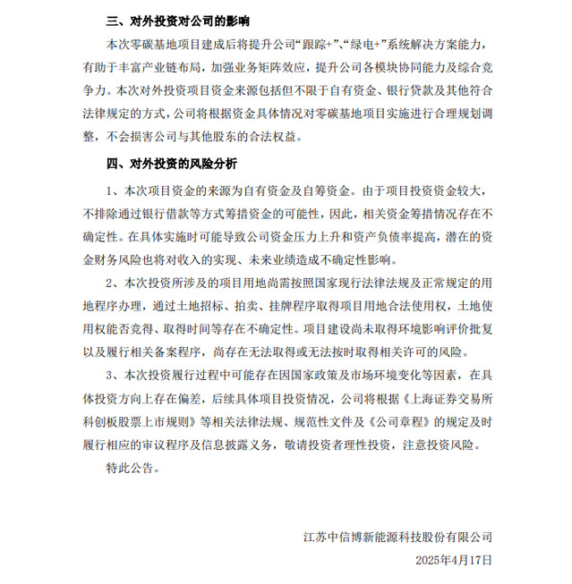 4月17日,中信博发布关于投资建设零碳总部基地项目的公告。