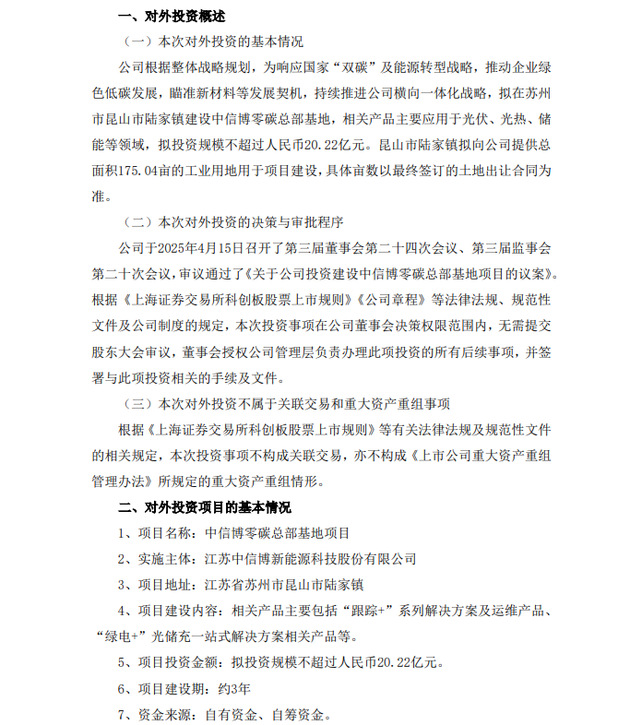 为响应国家“双碳”及能源转型战略,推动企业绿色低碳发展,瞄准新材料等发展契机,持续推进公司横向一体化战略,中信博拟在苏州市昆山市陆家镇建设中信博零碳总部基地,相关产品主要应用于光伏、光热、储能等领域,相关产品主要包括“跟踪+”系列解决方案及运维产品、“绿电+”光储充一站式解决方案相关产品等,拟投资规模不超过人民币20.22亿元,建设期约3年。昆山市陆家镇拟向公司提供总面积175.04亩的工业用地用于项目建设,具体亩数以最终签订的土地出让合同为准。