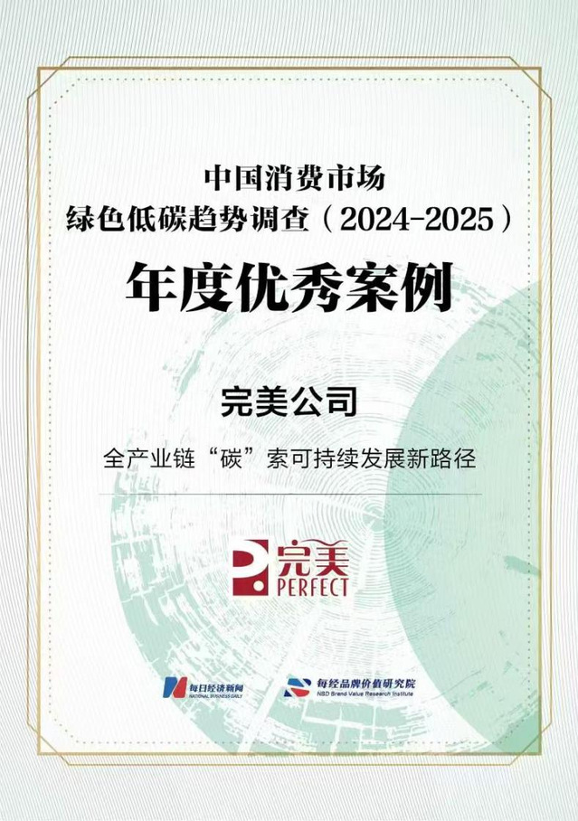 4月22日世界地球日,主流财经媒体每日经济新闻发布“中国消费市场绿色低碳趋势调查(2024—2025)”十佳及优秀案例评选结果,完美(中国)有限公司(简称“完美公司”)以在绿色低碳的深入探索和实践,入选“年度优秀案例”。
