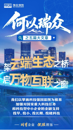 科技金融是实现我国高水平科技自立自强、建设科技强国的关键支持。作为国有金融企业,瑞众保险以金融“活水”擘画科技强国蓝图,高举“金融报国”国企担当。积极响应政策号召,坚定不移投“早”、投“小”、投“长期”、投“硬科技”,以450亿元投资科技金融领域,聚焦电子、通信、计算机等“卡脖子”关键领域,全力扶持太湖科学城建设,助力智能制造新高地。坚定不移统筹多种金融手段,为承担国家重大科技任务的支柱企业和“专精特新”的中小企业提供金融支持。