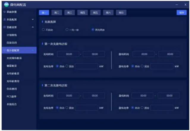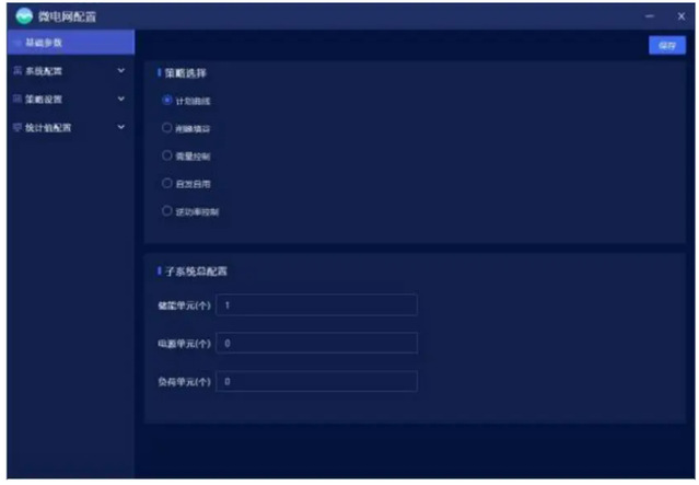 微电网配置主要对微电网系统组成、基础参数、运行策略及统计值进行设置。其中策略包含计划曲线、削峰填谷、需量控制、新能源消纳、逆功率控制等。