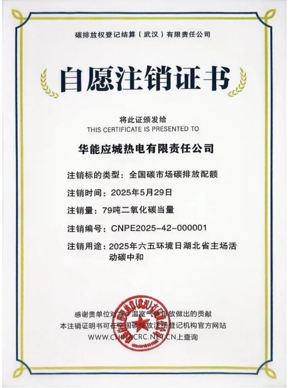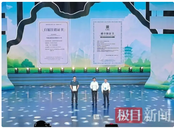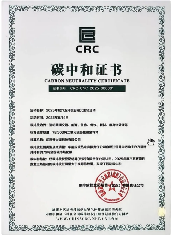 渐渐地,活动进入尾声。华能应城热电有限责任公司的负责人走上台,自愿注销并向活动主办方捐赠其持有的79吨全国碳市场配额。原来,本次活动在能源优化、交通管理、物资减量、食住节能的基础上,大约产生78.5吨二氧化碳,由全国碳市场控排企业华能应城热电有限责任公司申请自愿注销全国碳排放配额(CEA24)共79吨。经中碳登认定,本次活动的碳排放抵消量大于实际排放量,实现了活动碳中和。