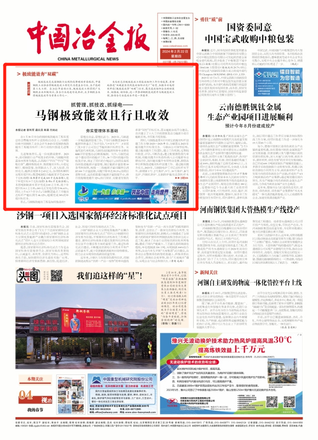 为及时总结极致能效工程能效标杆三年行动成果、更好地推进“双碳最佳实践能效标杆示范厂”培育,《中国冶金报》特别开设《极致能效奔“双碳”》栏目,聚焦能效标杆企业的好技术、好措施、好经验,进一步推动钢铁能效提升与极致能效工程,推动全行业能效水平进一步提升。在1月30日举办的钢铁极致能效工程年度总结会暨能效标杆示范验收启动会上,马钢股份被中国钢铁工业协会评为2023年度钢铁极致能效工程能效标杆三年行动组织推进先进集体。