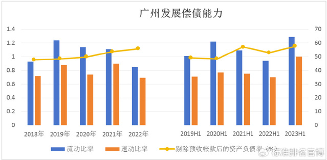 从半年报来看,2019年至2023年上半年,公司流动比率分别为1.01、1.22、1.09、0.94、1.29,2023年上半年公司流动比率较2022年同期相比有所上升。速动比率分别为0.37、0.31、0.49、0.61、0.59,2023年上半年公司速动比率较2022年同期相比有所下降。剔除预收账款后的资产负债率分别为43.00、44.24、41.50、43.03、38.82,2023年上半年公司剔除预收账款后的资产负债率较2022年同期相比有所下降。
