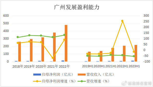 从盈利能力来看,2018-2022年,广州发展集团股份有限公司(简称“广州发展”),归母净利润分别为7.01亿元、8.06亿元、9.03亿元、2.03亿元、13.54亿元,2022年公司归母净利润较2021年同期相比有所上升。归母净利润增速分别为60.94%、73.02%、68.33%、-69.47%、88.91%,2022年公司归母净利润增速较2021年同期相比有所上升。营业收入分别为259.82亿元、295.34亿元、316.45亿元、379.1亿元、478.5亿元,2022年公司营业收入较2021年同期相比有所上升。营收增速分别为111.25%、128.76%、125.74%、112.38%、131.06%,2022年公司营收增速较2021年同期相比有所上升。