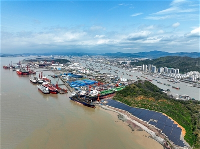 日前,俯瞰位于浙江省舟山市普陀区舟山万邦永跃船舶修造有限公司内的滩涂光伏发电站。