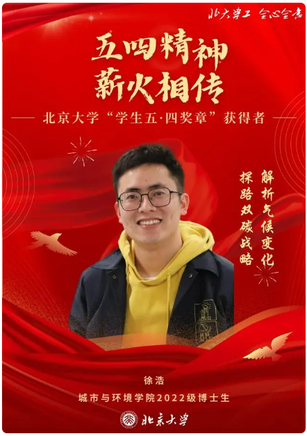 徐浩,北京大学城市与环境学院生态学专业2016级本科生、2020级硕士研究生、自然地理学专业2022级博士研究生,研究方向为全球气候变化与陆地生态系统碳汇。 近年参与发表SCI论文20余篇,其中以第一作者身份发表3篇(Nature Communications, PNAS, Science China Earth Sciences)。 曾获北京大学必和必拓“碳与气候”博士研究生未名学者奖学金、博士研究生校长奖学金、北京大学廖凯原奖学金、北京大学三好学生、北京大学学术创新奖等荣誉。