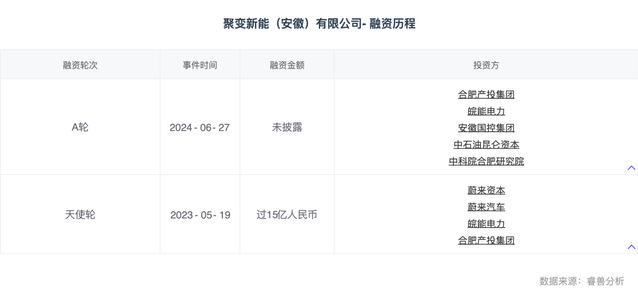 在融资方面,2023年5月,聚变新能完成了15亿元的天使轮融资,投资方包括皖能电力、蔚来汽车、蔚来资本和合肥产投集团;今年5月,该公司又获得了来自安徽国控集团、皖能电力、中石油昆仑资本、合肥产投集团和中国科学院合肥物质院的A轮融资,融资金额未披露。