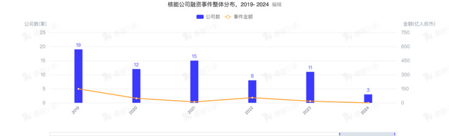 睿兽分析整理核能相关公司近年的融资情况,相比于未上市公司目前我国核能产业的上市公司数量较多,一级市场融资事件数量总体较少,其中2019年事件数达到历年最高。