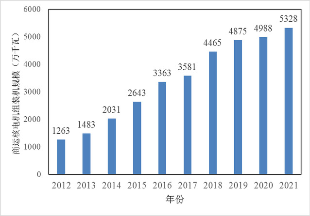 2012-2021年全国商运核电机组装机规模情况 来源:中国核能发展报告(2022)