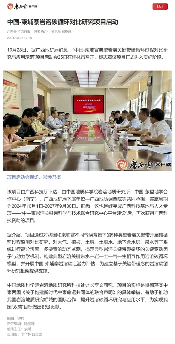本报南宁讯 2024年10月25日下午,广西重大科技专项——“中国-柬埔寨典型岩溶关键带碳循环过程对比研究与应用示范”项目启动会在桂林召开,标志着该项目正式进入实施阶段。