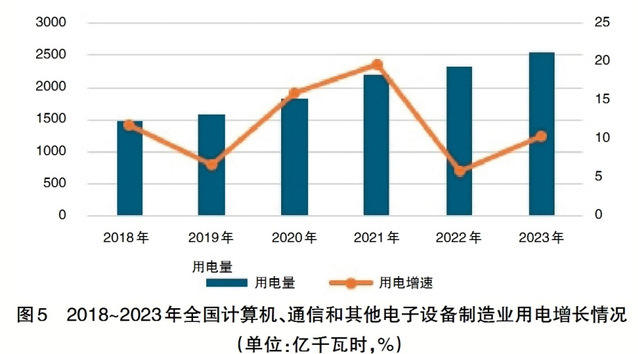 自2018年以来,应用服务侧的全国信息传输、软件和信息技术服务业用电量年均增长率高达14.6%,这一增速在国民经济行业用电活动划分的11个门类中排名第一(见图4)。2023年的用电量达1473亿千瓦时,凸显了信息技术服务行业对于能源的巨大需求以及行业自身的快速发展;同期,制造产业侧的全国计算机、通信和其他电子设备制造业用电量年均增长14.1%,达2548亿千瓦时,不仅满足了日益增长的算力需求,还促进了上下游产业链的协同发展(见图5)。