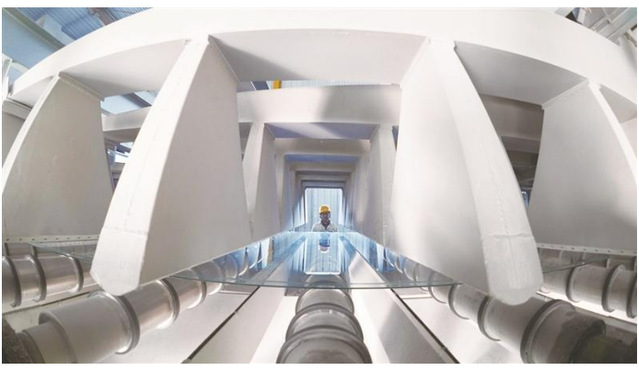 12月3日,山东金晶科技股份有限公司生产车间内,大面积钙钛矿电池用TCO导电膜玻璃正在紧张生产中。